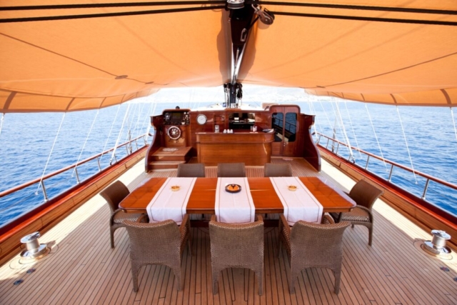 • For up to 12 people(2 master cabins-2DBL cabins with convertible bed-1 DBL) • 5 cabins with ensuite with hydromassage shower cells • Indoor-outdoor dining Saloon • Separate crew+capt. cabins with WC/shower • Indoor-outdoor dining • Fully equipped galley